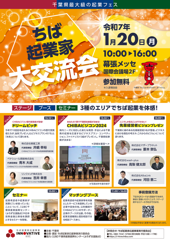 その他、「CHIBAビジコン2024」のファイナリストによる最終プレゼンテーションや、過去の千葉県知事賞受賞者による「ドリームピッチ」、起業家や起業を目指す方々に役立つセミナーや相談ブース、サポーター企業の出展ブースなどが開かれます。