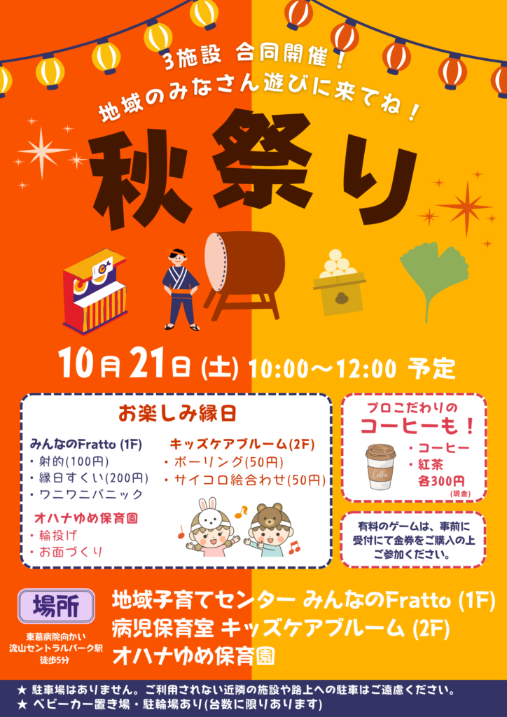 10月21日(土)に流山セントラルパークにある3施設合同の秋祭りを開催致します。
