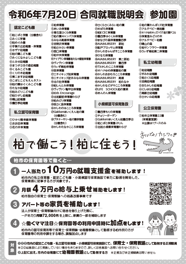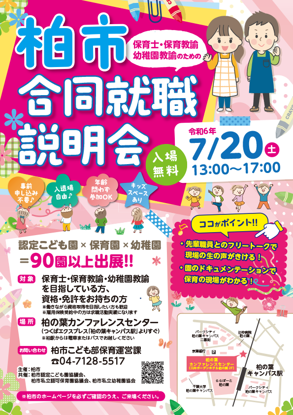 2024年7月20日(土)、柏の葉カンファレンスセンターにて『柏市合同就職説明会』が開催されます。当社運営からも、「オハナゆめ保育園柏の葉」「オハナゆめキッズハウス柏の葉チコル」が参加します。入場無料・入退場自由・申込不要ですので、是非お気軽にご参加ください。ご来場をお待ちしております。詳細は柏市はぐはぐ柏のサイトよりご確認ください。